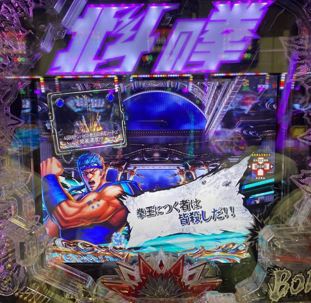 あれ? 昔の『北斗』ってこんなだっけ。キリン柄は? 赤死兆星は? 強敵ゾーンは? 何も起こりませんでした。と、少し思い出補正が強すぎましたね。何もないときはアッサリ。これぞ『北斗』です。また、今回は昔にはなかった先バレ系演出のケンフラッシュ、こちらのカスタムをONにして実戦しました。