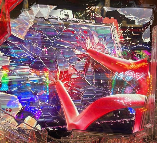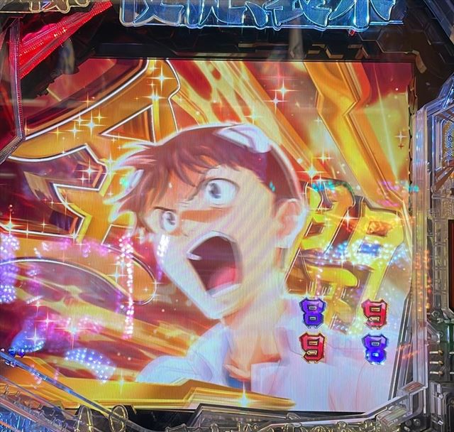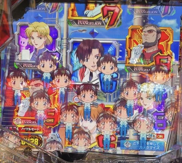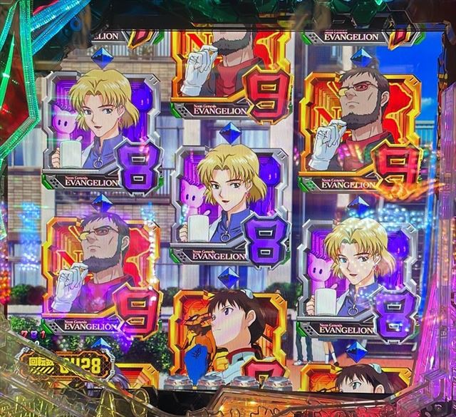 | 5 | デバイス振動→ロンギヌスの槍連続予告→ 変動開始時ランプ予告(ロゴ落下)→ セリフ予告(リツコ→マヤ)→テンパイ(8&9図柄)→ ミニキャラ群予告→ロンギヌスの槍通過予告→ 初号機リーチ(モニターCI赤・セリフ赤・最終CI金)→ 大当り!(8図柄)→昇格ナシ→時短100回へ |