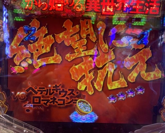 | 1 | 先バレ赤(ポキューン)→擬似2→ とぼけないでください予告(内容:チャンス)→擬似3→ 鬼がかってますね予告→ 絶望バトルSPリーチ・ペテルギウス(タイトル白・ テロップ白・イルミ金・カットイン金・鬼アツボタン)→ 大当り→コンビニ経由で7図柄に昇格 |