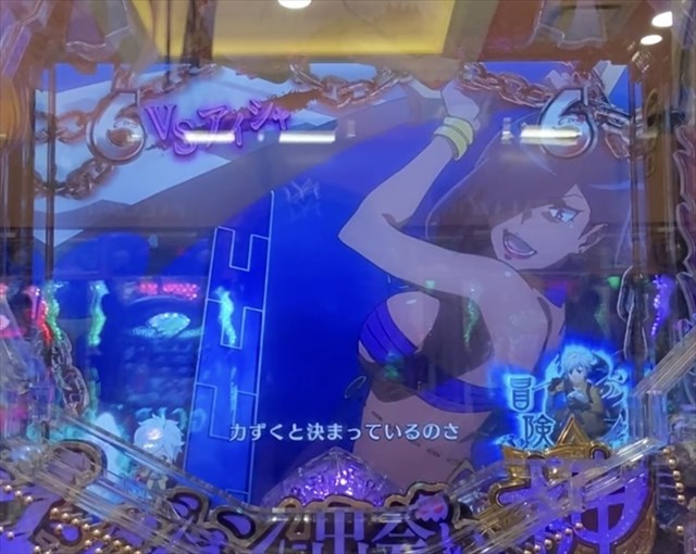 | 13 | 保留変化予告(点滅)→アビリティアップ予告(青)→ 擬似連予告(×2緑)→神聖文字予告(赤)→ ヘスティア飛びつき予告(擬似連)→擬似連予告(×3赤)→ 神聖文字予告(赤)→ダンジョン連撃SU予告(SU2)→ リーチ→リーチ後背景予告(リリルカ)→ SP発展演出(導光板紫)→バトルリーチ(VSアイシャ)→ ハズレ |