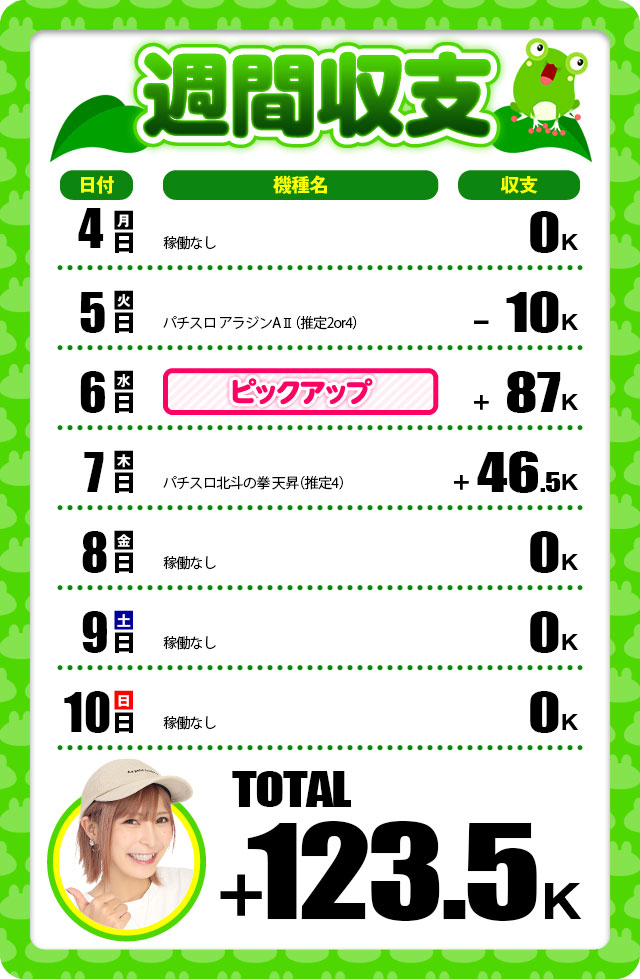 今週はさほど稼働していなかったのですが、結構プラスにできたという点では半分満足。あとの半分は設定6が入っているホールに行ってるのに掴めてないというのが、納得いかないところでした。