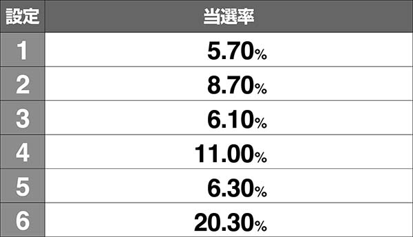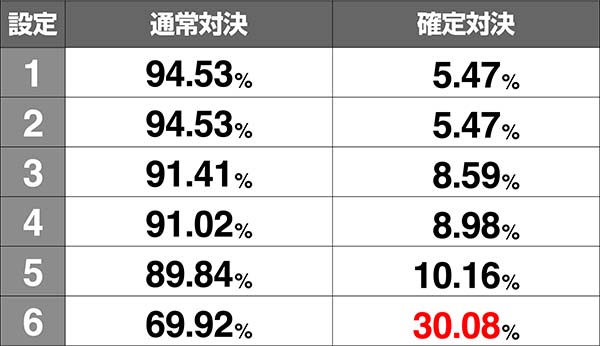 といった感じで、偶数設定、尚且つ高設定ほど出現しやすく、更に設定6だけ確定対決が選ばれやすくなっています。※確定対決を完全に見抜くことはできないので要注意