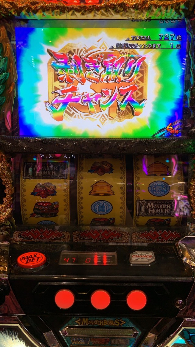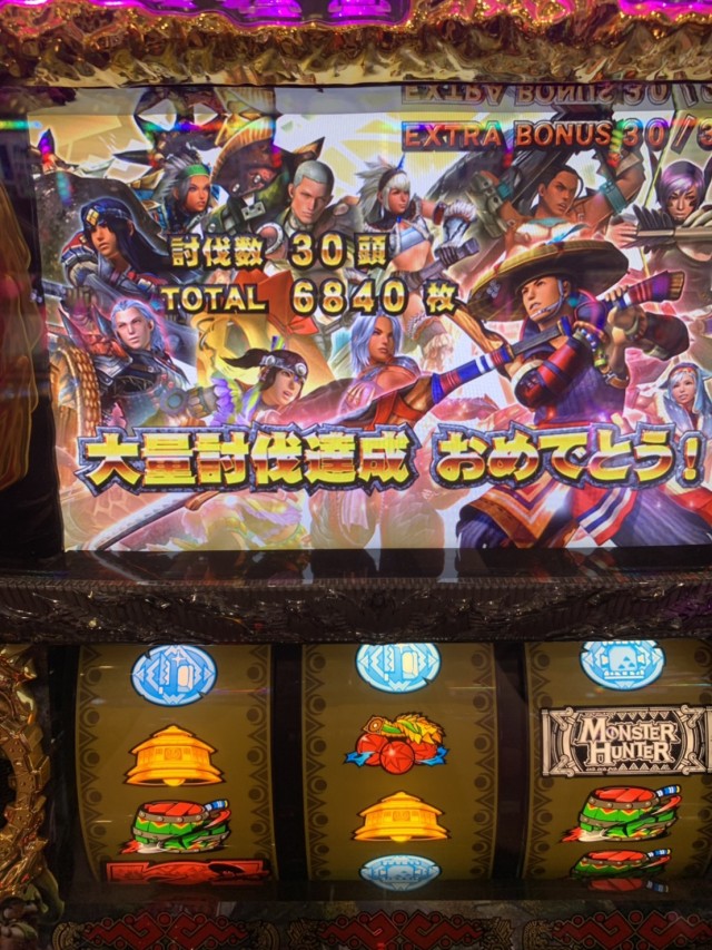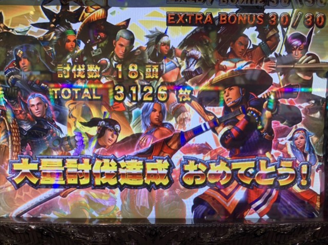 設定4を打つと、よくこの展開になるので一旦手を止めてふらっと周りを見に行くと、やっぱり増台したモンハン月下が賑わっています。