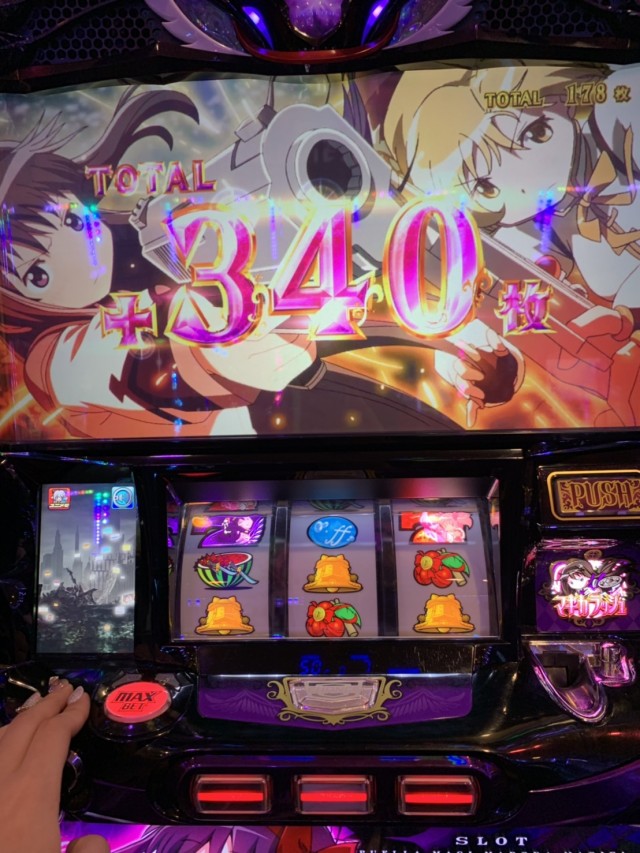 チャンス目や強チェリーからのボーナス当選は良いけど周りがあまり良くなくて、なんだかパッとしない感じなんですが、私も直撃を引いてまどマギ叛逆での出玉が2200枚まで増えたのでもうすこし粘ることに。