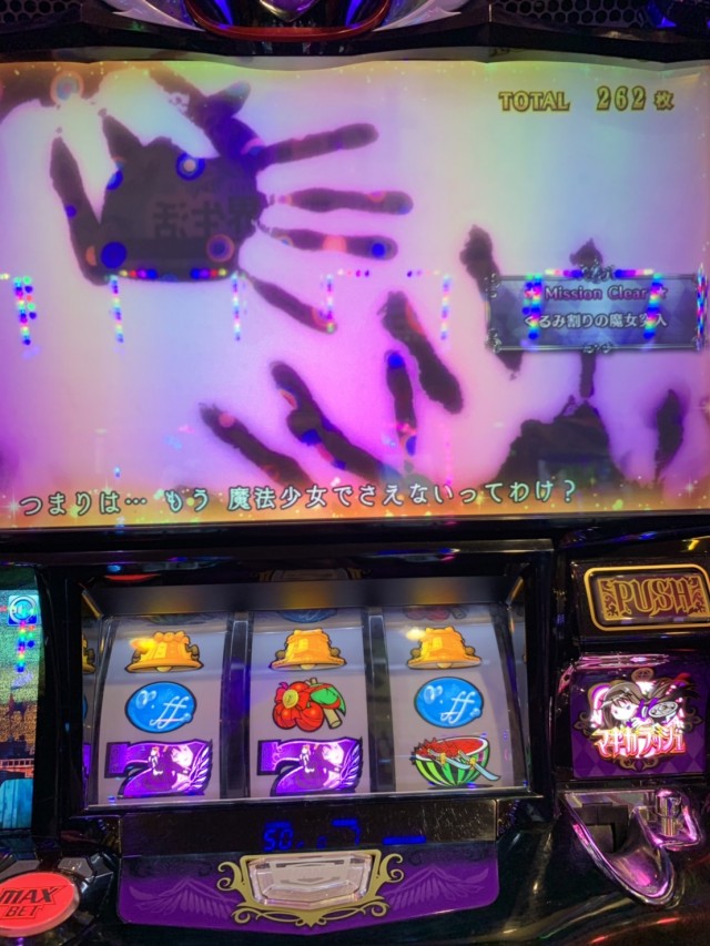 200Gの後半でマギカボーナスが当たり、マギカチャレンジでATに入れられなくて「あぁぁぁ」ってなっていたら、次の1G目に…