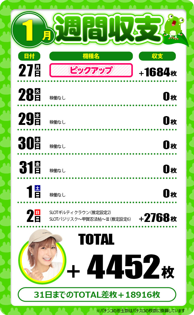 朝の1番出ているところから打ち始めたので投資1000枚、回収2684枚、プラス1684枚でした。