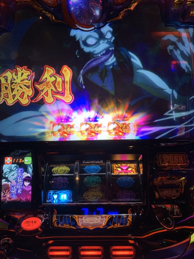 その後、超高確中に巻物を引きババーンと液晶に7が揃いBTへ突入しました。