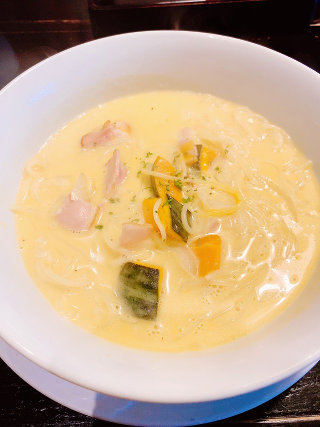 とあるパスタ屋さんのカボチャクリームスープパスタ。