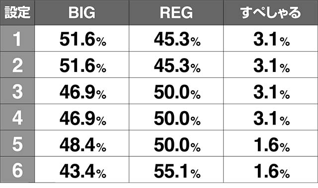 ちなみに高設定ほどREGを引きやすく、設定6のREG比率が特に高くなっているところは設定推測のポイントですね。