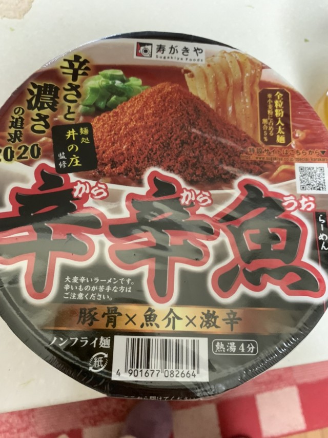 反省の日なので家に着いてから、辛辛魚のカップ麺で自分に刺激を与えておきました。味はとても美味しいので、辛いものが好きな方におすすめです。