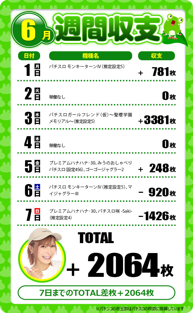 ハナハナもマイジャグIVもチラホラ当たっている台はあるんだけど、パッとしないなと思ったので、-1kのところでお店を出ました。