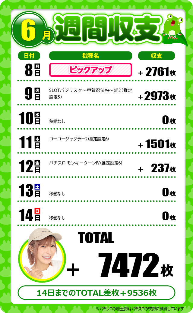 こんな感じで4戦4勝。今週は、「私に神様が付いてくれているのでは?」と思えるくらい高設定に座ることができました。