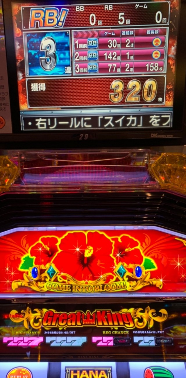 と言っても、6というより4.5のが多かったですが。末尾に高設定を入れるホールではないので、珍しいなぁ〜と思いましたが。毎週金曜日はハナハナが強くて、でも取れなくても他にチャンスがあるホールなんですよね。