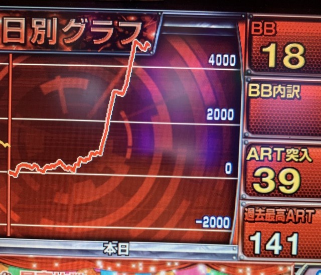 すんごい一直線なグラフ。前にスカガで万枚出てるのを見たことがあるのですが、こうやって出すのか~と実感できました。スカガの4・5は、ヤラかせれば6より出ますね。夢あるぅぅ!!