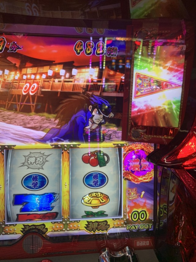 3日目で轟大寺に行き、対決に勝利しまして、番長ボーナスゲット。レア役は引いていないのに青7でした。