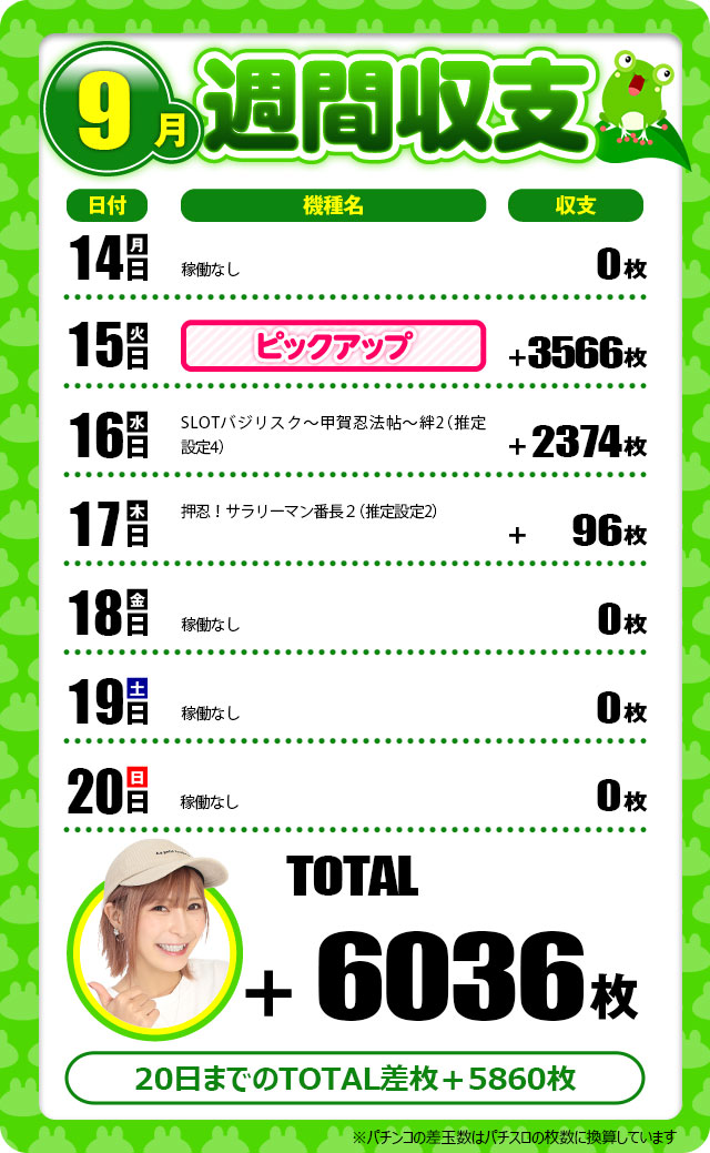 今週は勝っているけど、冷静に振り返ると高設定に座れていないんですよね。抽選が悪くて狙い台が取れなかったからってのもありますが…、最近稼働できていないしパチスロ力が鈍ったのかもしれん。勘を取り戻せるよう頑張ります(笑)。
