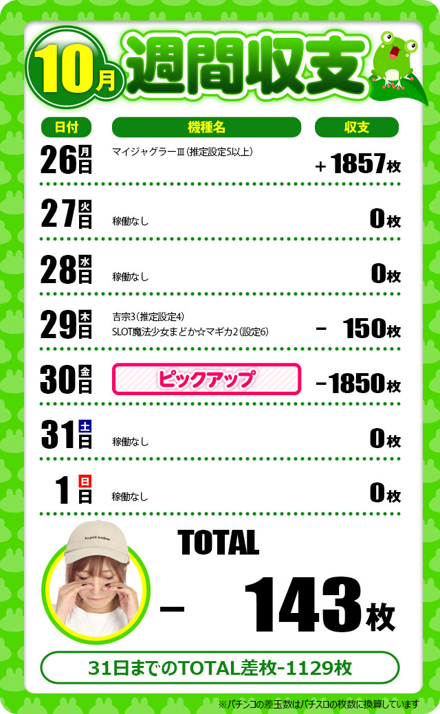 結果、10月のトータル収支は負けで終わりました。震えるくらいパチスロで全く勝てない月だったなあ…。11月はヒキが戻ることを祈ります。