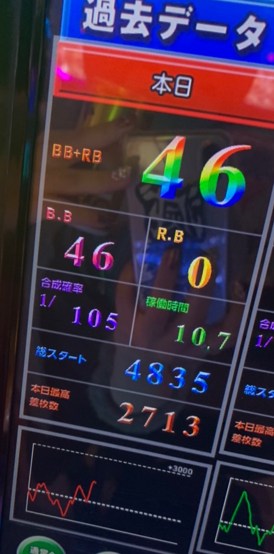 今回の立ち回りポイントは、末尾は気にせずに全台狙いをしたこと。全台狙いする人が少ないので立ち回りやすかったですね。あとはポイントとか特にないかな(笑)。とはいっても、高設定があるという状況のホールを選んでいるからこそ、狙い機種を絞れたり立ち回りの作戦を立てやすかったりっていうのが大きいです。