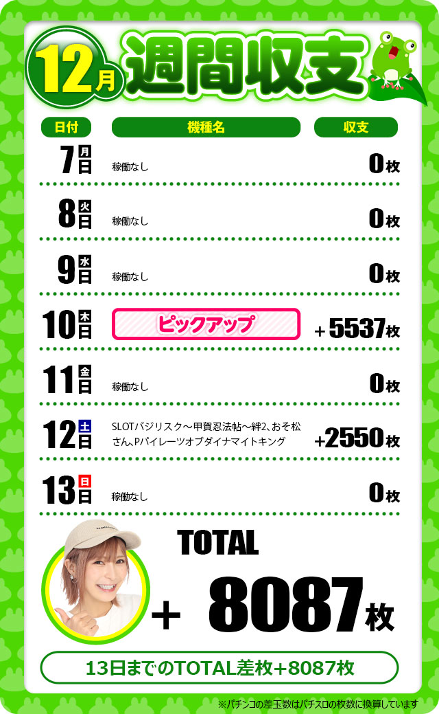 そんなどうでもいい話はさておき、今週の収支を発表したいと思います。
