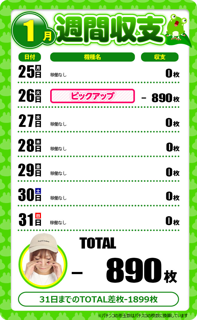 でした。高設定を打っていたはずなんだが…マイナス。まぁでも、モンハンワールドの設定5がどんな感じなのか経験できたのでヨシとします。