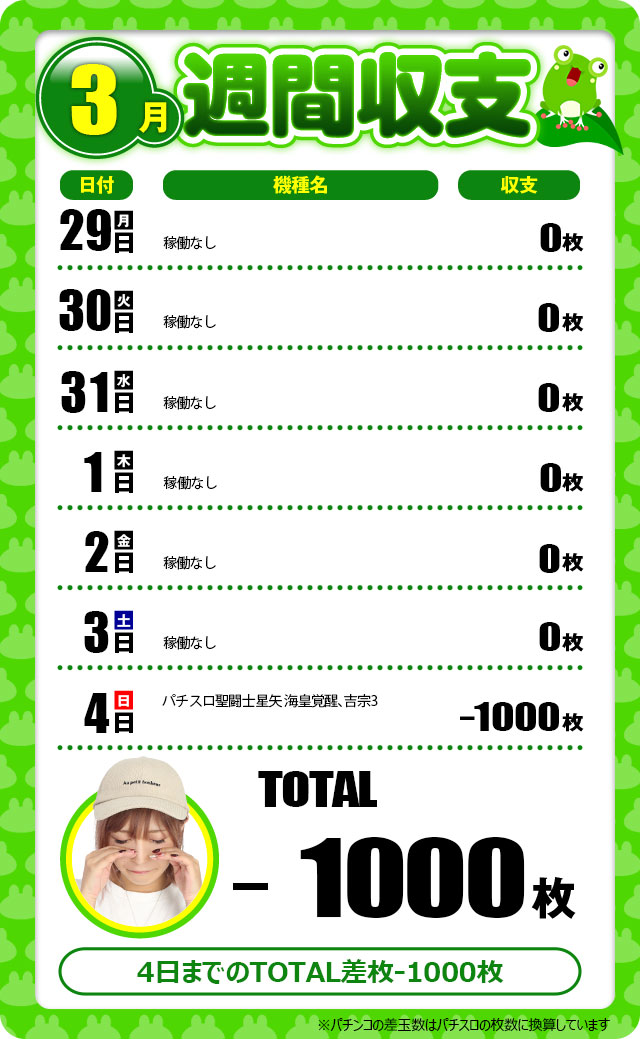 てなわけで今週の収支は-1000枚でござる。吉宗3は6以外だとヤレなきゃキツい。6でもBIG下手くそだとキツイのでね。