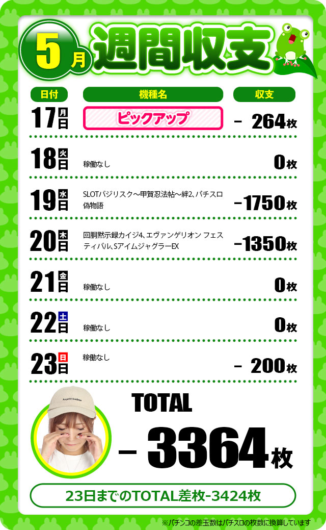 通常時のボーナス11回中5回ARTに入ったので間違えなく上だと思うんだよなぁ…と思いながら帰りました。結局収支は、