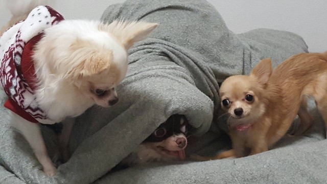 ひすい(真ん中)はつくね(茶色)に怒り