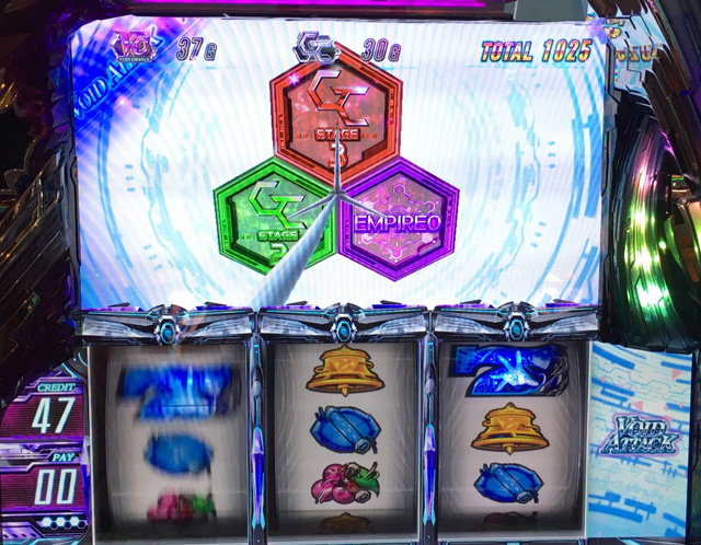 VoidAttack中の弱チャンスRや赤7揃いは、ARTのセットストック獲得に影響するステージのランクUPが確定。ステージのランクは1~3まであり、CZ中の強チャンスRでARTを引き戻した際にステージ3が選ばれていれば、VoidAttackでレア役を引いた時点でARTストックの特化ゾーンである「エンピレオ」からARTがスタートすることが確定します。