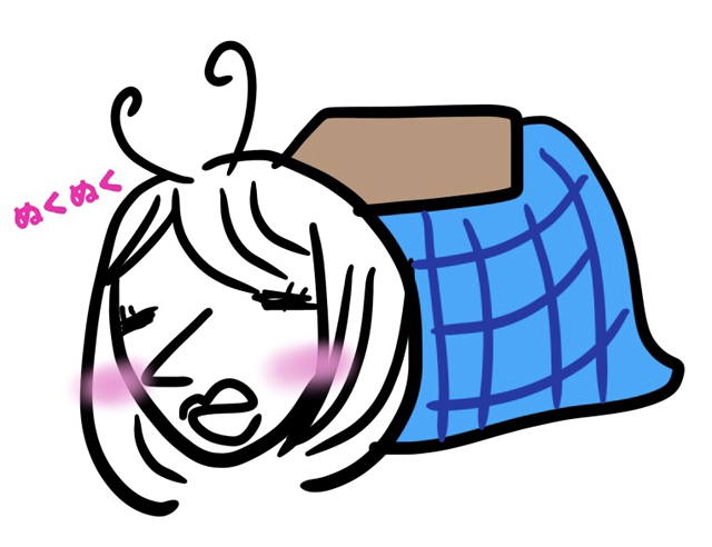 まーまあたりも一瞬でコタツムリになりそうだ。 もし必勝本女子がみんななるみん宅でコタツムリ化してしまったら、「暑い」と言い張ってたおつるさんに塩でも撒いてもらうしかないな! 頼んだぜおつるさん!