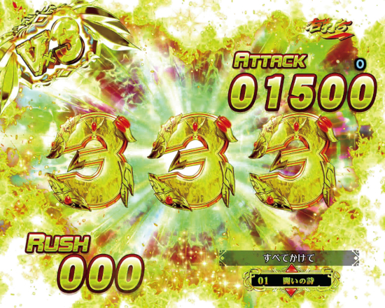 RUSH中の大当り振分けは3R、6R、9Rの3種類。6Rか9R大当りならリセット濃厚、奇数図柄や虹図柄揃いもリセット濃厚など、様々な演出法則が存在するぞ。残りVが1個で発展する「ラストバトル」は勝利でリセット=RUSH継続濃厚だ。