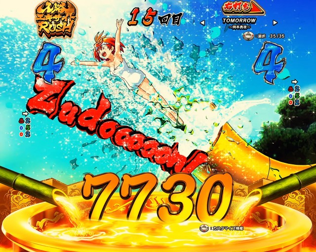 「3000 over FEVER」消化後は、1回転の時短「入浴エキサイトRUSH」へ突入。図柄揃い確率は約1/1.1でRUSHトータル継続率約90%と、ライトミドルとは思えない破格の数字を実現している。
