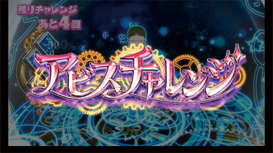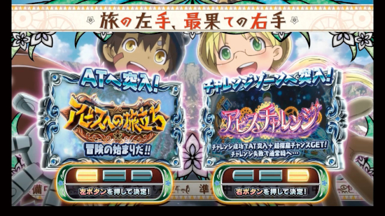 向かって左の「アビスへの旅立ち」選択時は、安定のAT突入路線。右の「アビスチャレンジ」は、演出成功で高期待度のATを獲得できるが、失敗時はそのまま通常へと戻ってしまうハイリスク・ハイリターン型だ。