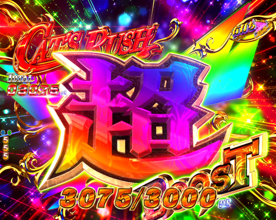 本機の右打ち「CAT’S RUSH」は転落タイプを採用した超高速型の連チャンゾーンで、大当り出玉はALL1500個OVER。その内3000個獲得の振分けが25%もあるため、優れた一撃性能を有している。転落確率や次回連チャン濃厚当り等を踏まえた、トータルのRUSH継続率は約80%だ。