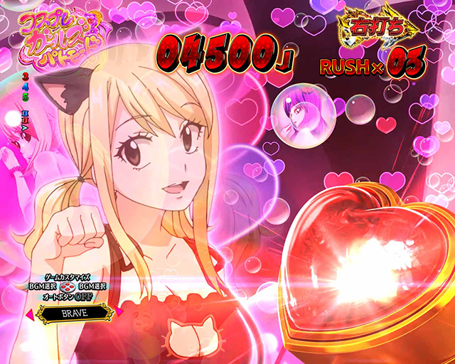 本機は図柄揃い確率1/399.6(通常時・FTチャージ除いた図柄が揃う確率)で、そのうち約5%がラッキートリガー「七炎竜RUSH」に直行。その他の約95%では出玉約1500個が獲得でき、さらに「炎竜王覚醒チャレンジ」に成功で継続率約65%※1の「FAIRY RUSH」に突入となる。