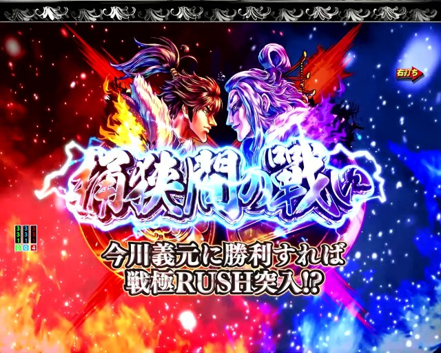 RUSHは通常時の図柄揃い大当り後、または「篝火CHALLENGE」演出成功後の「桶狭間の戦い」で、バトルに勝利することで突入する。