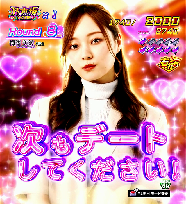 超乃木坂RUSHは、大当り出玉約1000個で継続率約88%のループタイプのRUSHだ。乃木坂46のメンバーが登場する5つのモードから選択し、好みの演出で楽しめる。