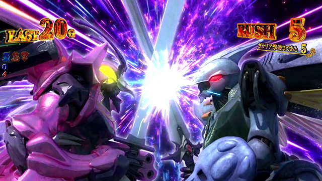 ダンバインRUSHは継続率約91%で、BONUSとのループで出玉を増やしていく。枚数上乗せフラグ「オーラアタック」を引くことができれば、100枚以上の上乗せ連打が発生。最低50%、最高約95%でループしていくぞ。上位STであるビルバインRUSHなら、オーラアタックが超高確率で発生!!