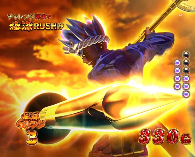 RUSH突入率は約52.2%で、主に初当り獲得後の「極源チャレンジ」成功で本機のラッキートリガー「極源RUSH」に突入する。