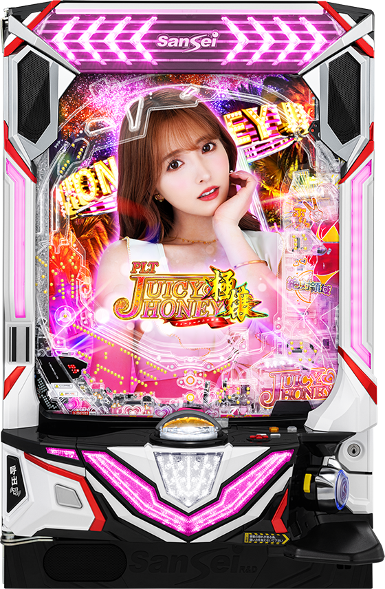 本機は大当り確率1/199.8のSTタイプ。初当り時の61%がST50回転の「ジューシーハニーRUSH」に突入となる。ジューシーハニーRUSHは継続率約55%で、「SUPER HONEY BONUS(出玉1000個)」と「極嬢HONEY BONUS(平均出玉3000個)」の2種類の大当りを搭載しているぞ。