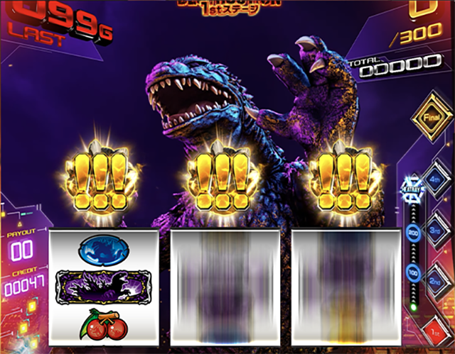 上位AT「G-RUSH 大怪獣モード」は初期ゲーム数100Gで、上乗せ性能が大幅にアップした超特化型AT。レア役成立で「怪獣バトル」突入の抽選を行い、怪獣バトルはゴジラが勝利すれば30〜100Gが上乗せされ、さらに必ず移行する「G-CHANCE」で成功すれば獲得ゲーム数が2〜5倍に増加するという強力な性能を誇る。