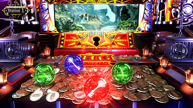 本機は機械割が97.4%(設定1)〜111.3%(設定6)で、純増約8.2枚/GのATタイプ。通常時は液晶画面にてプッシャーゲームと呼ばれるコイン&ボール落としが展開され、ボールが落ちればCZに突入する。CZは「1stジャッジ」(突破率約20%)、「2ndジャッジ」(突破率約37%)と進んでいき、6Gの「ジャッジメント」(突破率約47%)で宝箱を開放できればAT突入だ。
