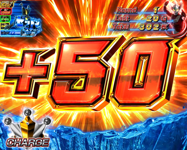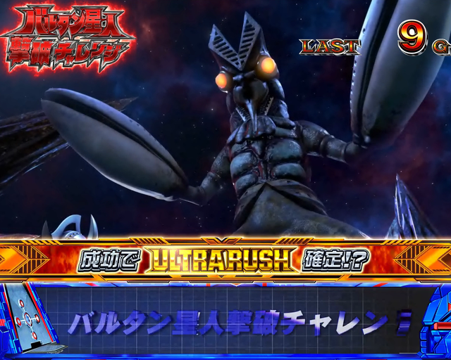 通常時の一部で当選する成功期待度約40%のCZ「バルタン星人撃破チャレンジ」を契機としたATでは、RUSH終了時に必ずCZに当選。