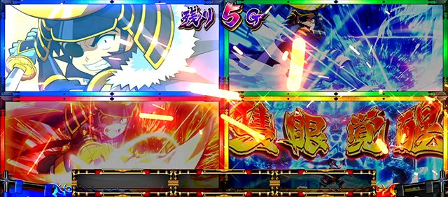 純増約2.4枚/GのAT「隻眼ノ乱」消化中はベルやレア役などから「天下激闘」を目指し、武将を撃破できればゲーム数上乗せとなるが、勝利時の一部で秀吉決戦に突入することもある。また、AT終了後は必ず戦極へ突入するため、戦極→秀吉決戦→AT→戦極…のループで6号機の壁を超える大量出玉が狙えるAT性能に要注目。
