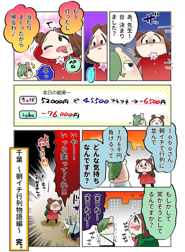 ちょぼらうにょぽみ(@choboraunyopomi)4コマ漫画家。自由な作風でネットを炎上させるだけでなく、火事で自宅を炎上させたこともある唯一無二の存在。この日は午前中ですでに-5万負け。