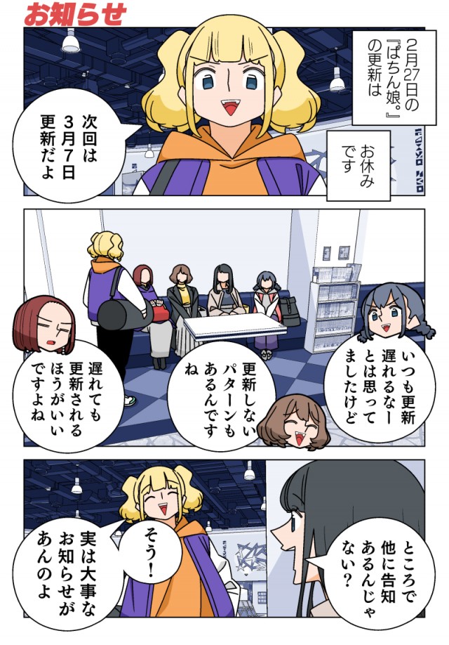 いつも『ぱちん娘。』をご覧いただきありがとうございます。毎月7が付く日は、ぱちん娘。の更新日でしたが、次回更新は3月7日(金)予定になります。