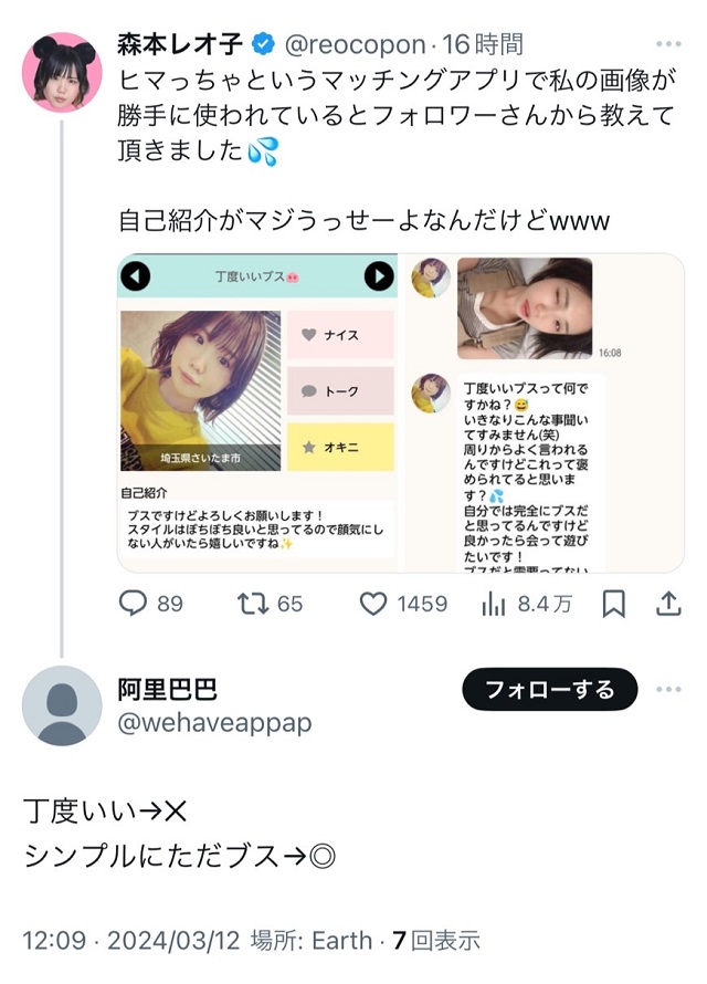 先日Xでもポストした通り、とあるマッチングアプリにて私の画像が無断使用されていることが発覚しました。詳しいことはパーラーフルスロットルにこれまた無断転載されているので各々が目を通して頂けると幸いですが、どういうものであったかの画像は一応掲載しておきます。