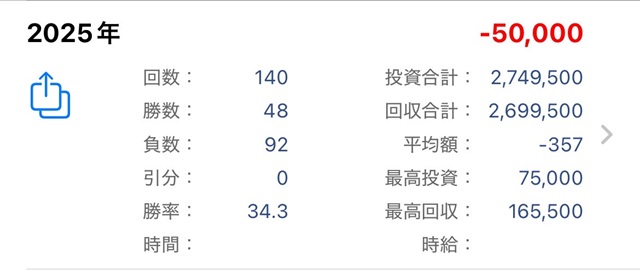 大負けもNG、大勝ちもNGとなると、私たちに残された道はチャラ線しかないわけで。と、ここで私めの2025年の年間収支にご注目ください。