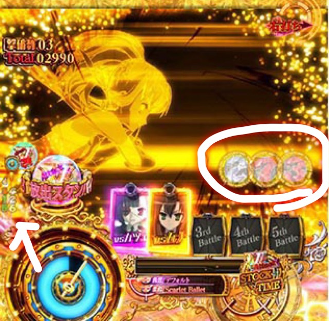 画質が粗くて恐縮ですが、画像右の丸で囲んだ部分が見せかけの図柄、左の矢印部分がガチの図柄です。液晶上ではやれ様々な演出が華々しく起こりますが、左の図柄が揃えばストック確定です。