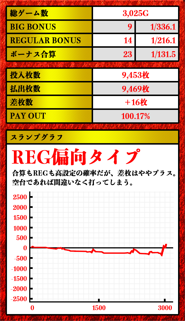 王道な立ち回りだとは思いますが、REGに偏る台はそのまま終日凹むことが多い…みたいなオカルトもあるわけで。そのあたりを確かめていきましょうか。