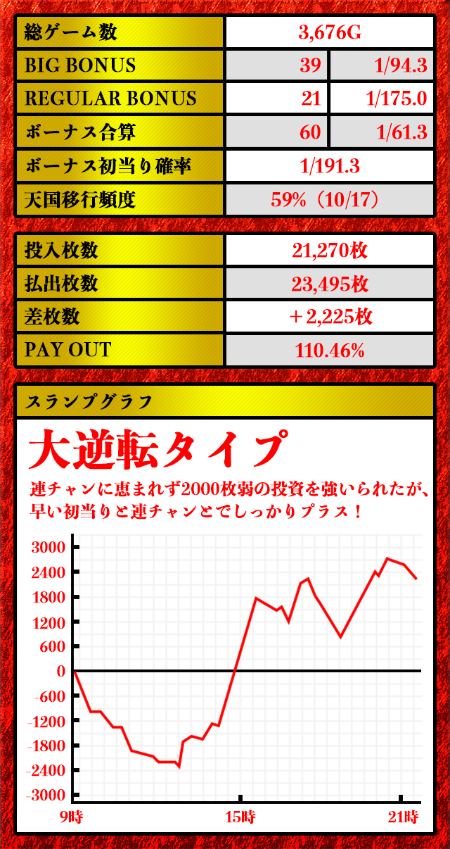 どんな設定でも波が荒いというか、暴れるというか、そんなイメージですかね。設定がわかった上で『沖ドキ』の挙動を見たことがないので、果たしたどんな結果になるのでしょうか!